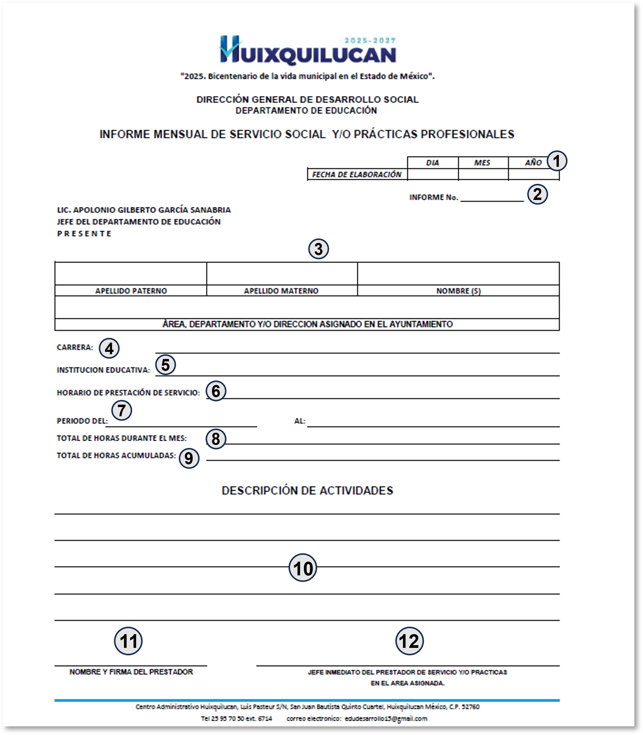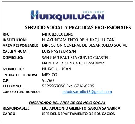 Se informa a todos los estudiantes interesados en realizar su Servicio Social o Prácticas Profesionales en el H. Ayuntamiento de Huixquilucan que la Dirección General de Desarrollo Social es la única instancia autorizada para gestionar, coordinar y validar estos trámites. Es obligatorio que todo el proceso desde la solicitud hasta la liberación sea gestionado a través de esta Dirección, cualquier Servicio Social o Práctica Profesional que se realice sin haber cumplido con el procedimiento oficial establecido por la Dirección General de Desarrollo Social no será reconocido ni válido para efectos escolares, institucionales o administrativos. Para evitar inconvenientes, se recomienda a los estudiantes acercarse oportunamente a esta Dirección y asegurarse de cumplir con todos los requisitos y etapas del proceso.